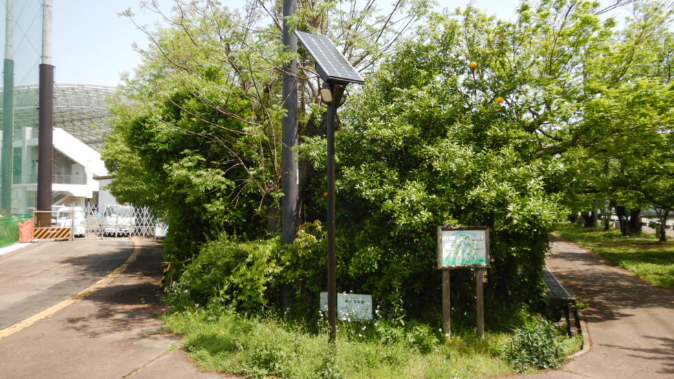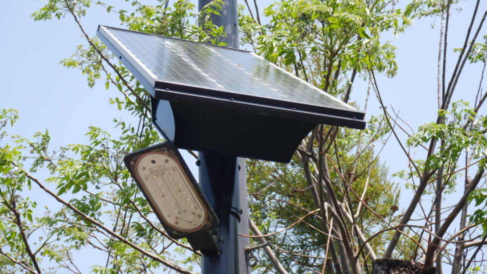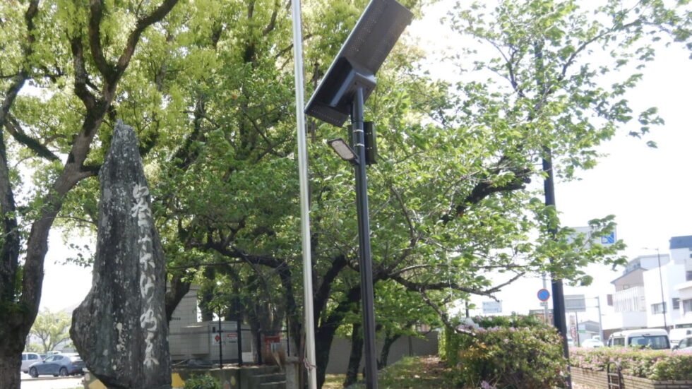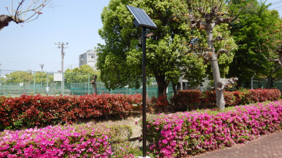 総合運動公園の災害時避難誘導照明も兼ねたソーラー照明 洪水や高波にも備え、バッテリーを上部に配置した製品を選定。