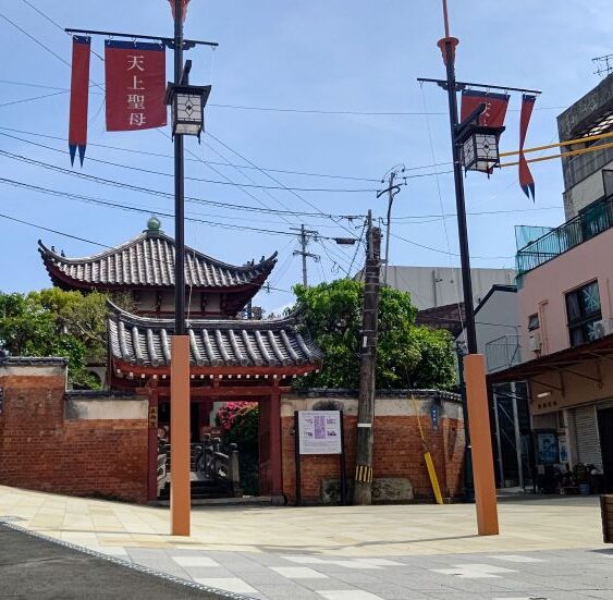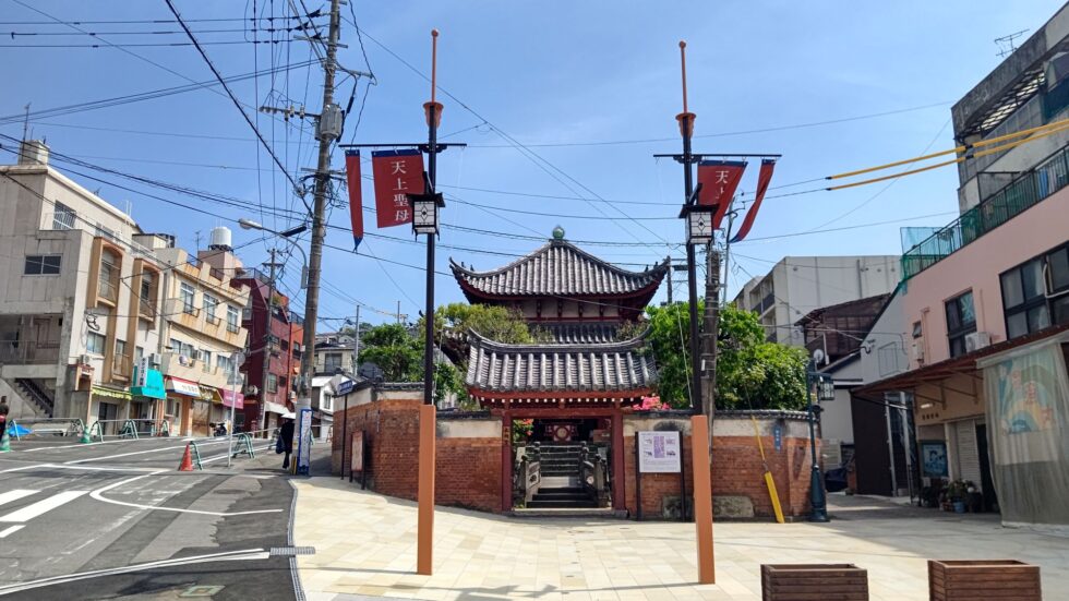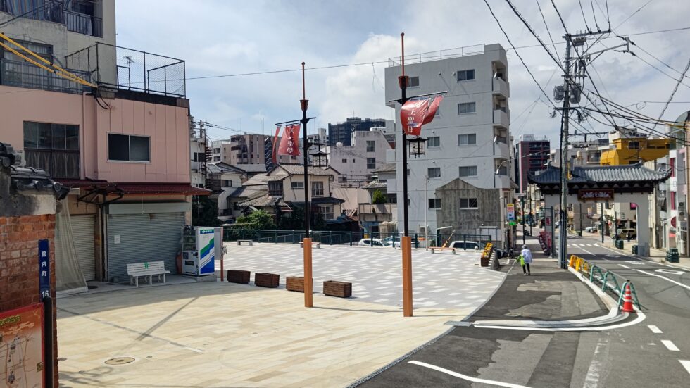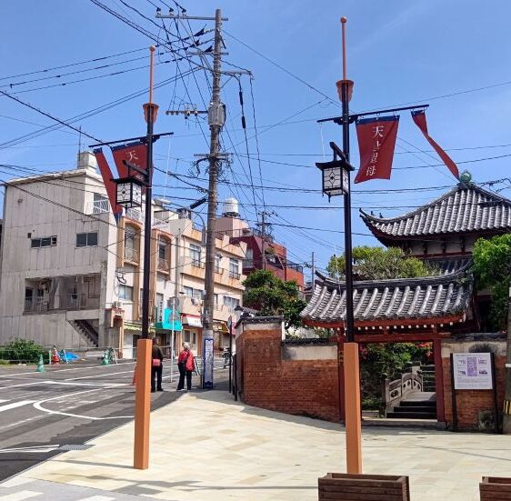長崎市内の歴史建造物の土神堂前のデザイン照明灯